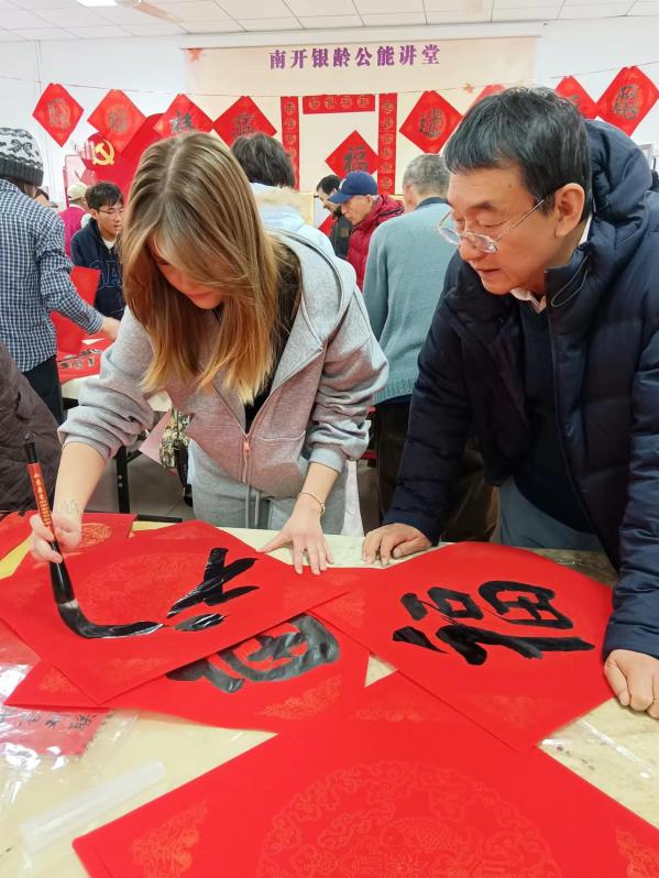 1月22日上午,离退休人员管理处西南村活动室内墨香四溢、暖意融融,由离退休人员管理处与国际教育学院、汉语言文化学院联合主办的“银龄送福暨理解当代中国——国际学生中华传统文化体验活动”在此温馨举行。南开银龄书画协会的退休老师们与国际学生齐聚一堂,以笔墨为媒,共写“福”字、共迎新春,沉浸式感受中国传统文化魅力。