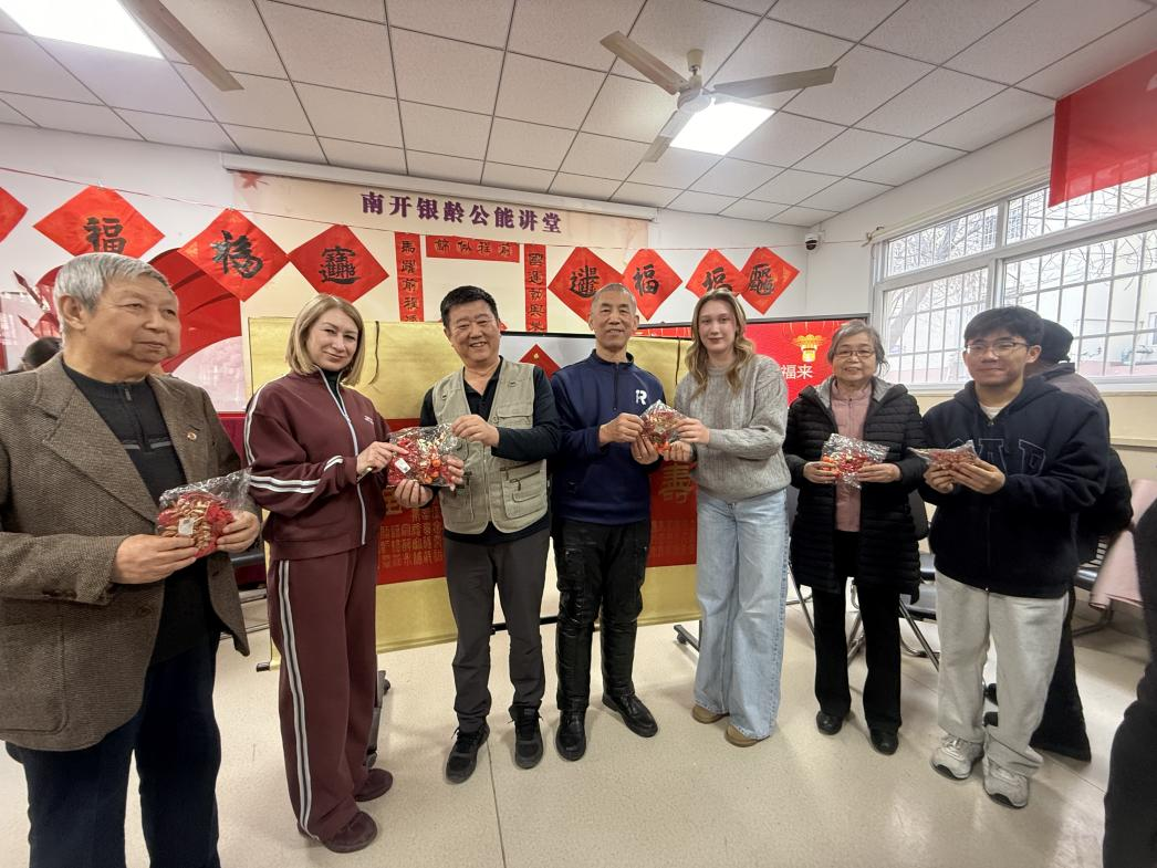 为表示感谢和祝福,学生代表向南开银龄书画协会的老师们赠送了精心准备的新年礼物。这份亲手制作、满载心意的中国结,体现了南开尊师重道的传统美德与跨越国界的师生情谊。